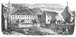 - St. Afra zu Meissen; Wikimedia Commons, gemeinfrei, Quelle: Illustrirte Zeitung, Nr. 6 vom 5. August 1843, J. J. Weber, Leipzig 1843. MDZ München